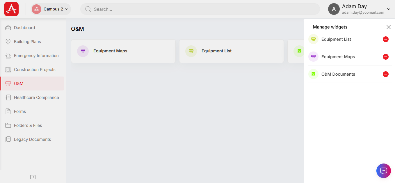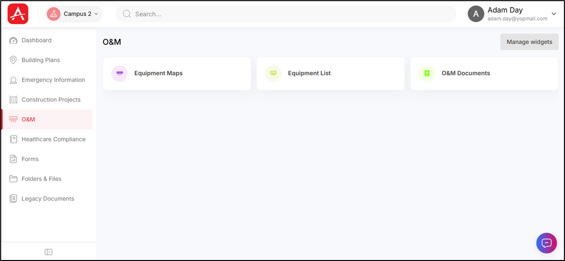 From inside the Dashboard of a campus, click the [O&M] module option from the left-panel to view the three widgets inside the module.