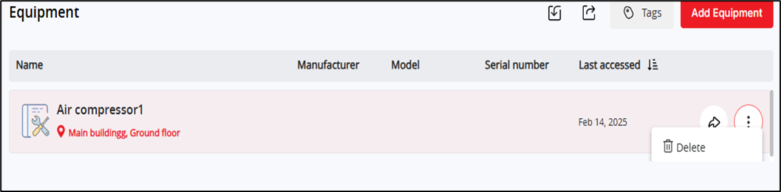 - Click the ‘More options' button to find the equipment ‘Delete’ option.