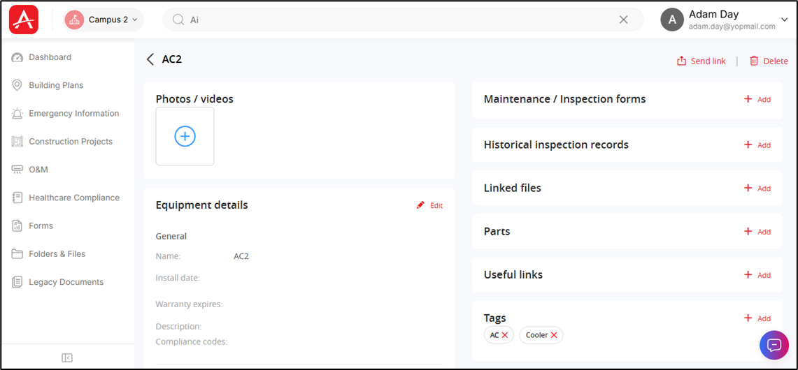 You can edit change/delete the equipment photo, modify equipment General details, Manufacturer/Model & Location. Also, you can view/remove/attach forms, view/download/attach supporting documents, view/edit parts information, view/edit links & remove/associate tags.