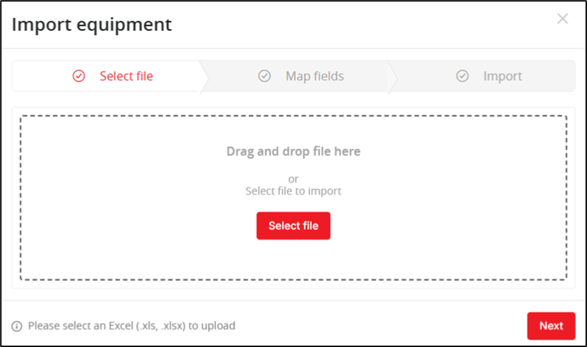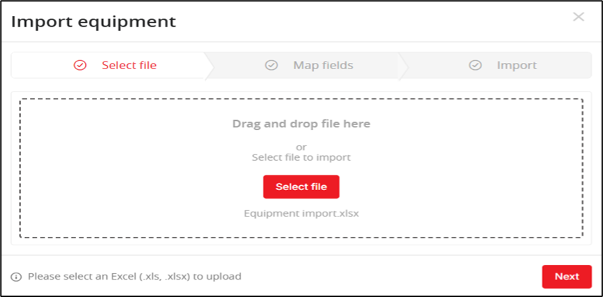 The bulk import screen appears after you click the [Import] button where user can upload a CSV or excel file from local computer and map the columns in the file with equipment fields in the application.
