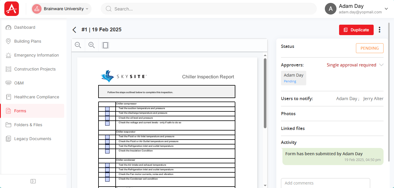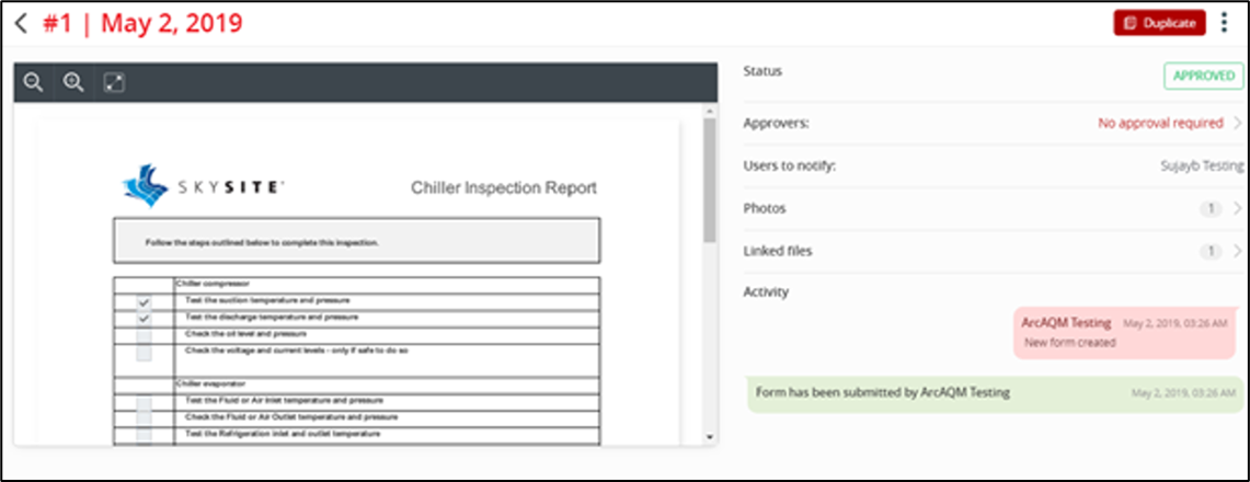 This functionality will provide you with a quick and easy way to duplicate information from a prior form and will minimize the required data entry. For instance, when filling a maintenance log for four machines of the same type. The user could duplicate a form, update the serial number, update any maintenance info and submit, rather than having to complete the entire form from scratch.