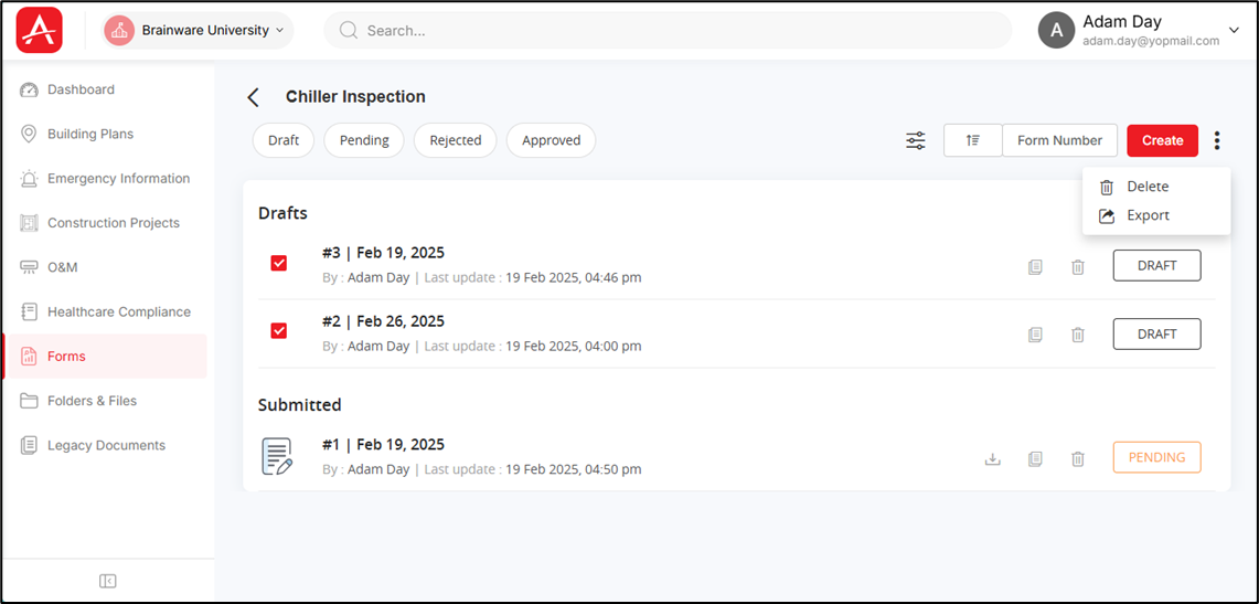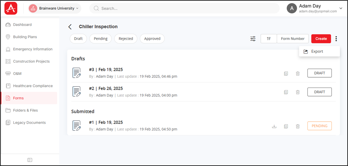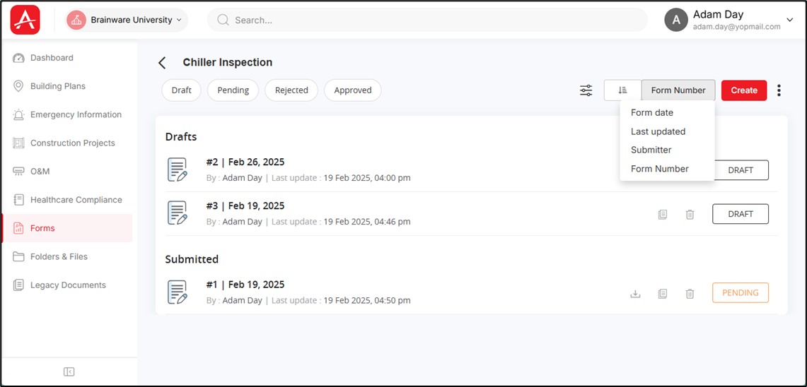 You can click on the Draft, Pending, Rejected, Approved tab at the top to view the forms under this template with that specific status only. For example, if you click the [Pending] tab, then all the forms (under this template) with the status as ‘Pending’ are displayed.
