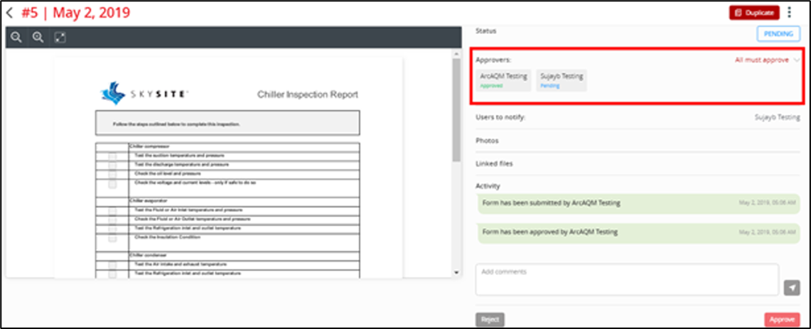 You will be able to view the info selected/entered in the template (non-editable – you won’t be able to change template info) based on which the form is created, the user to notify (if any), the files and images attached, and the status changes history & comments under the Activity section.