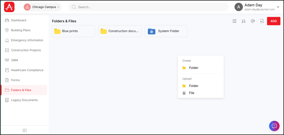 - Click the [Add] button (from the top right corner of the screen) or right-click in a blank space to create folder or upload folder(s)/file(s).