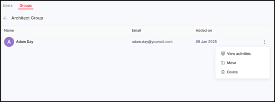 - Invited user – Edit user, add to group (if added as an individual user), delete the user, view activities and invite again